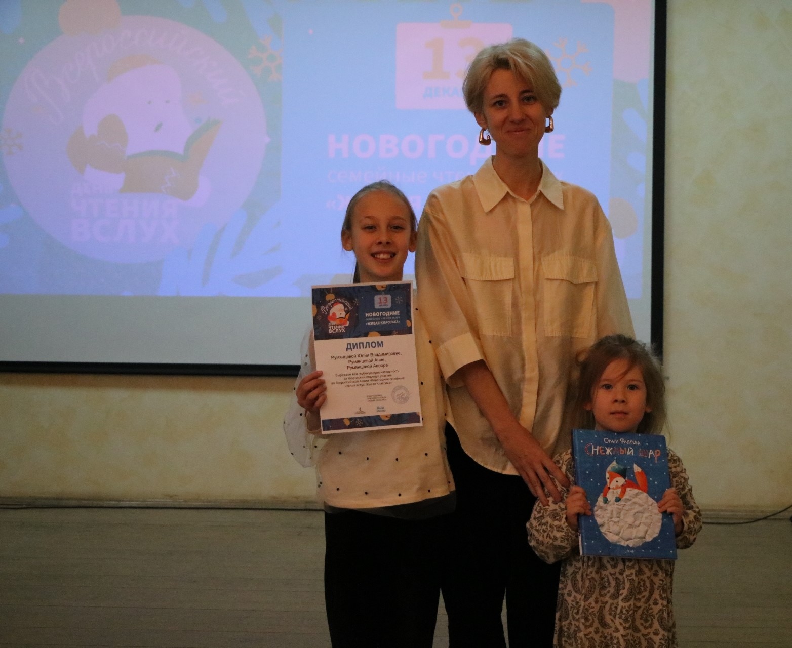 Новогодние семейные чтения вслух 13 декабря Анна Румянцева, учащаяся объединения «Мастерская традиционной и современной игрушки» Центра творчества, вместе с мамой Юлией Владимировной и сестренкой Авророй приняли участие в акции «Новогодние семейные чтения вслух. Живая классика», которая проходила в Центре дополнительного образования Липецкой области и собрала более двадцати семей со всех уголков нашей малой Родины. Семьи поздравила заместитель директора Центра и бессменный куратор конкурса юных чтецов «Живая классика» Эрика Подугольникова. Праздничное настроение создали Дед Мороз и Снегурочка, а также юные артисты образцовой музыкальной студии «Камертон». В зале царила невероятная атмосфера вдохновения и тепла. Каждая семья представляла отрывки из своих любимых произведений, погружая всех присутствующих в волшебный мир литературы. Три минуты длилось каждое выступление, в ходе которого у зрителей то появлялись слезы от проникновенного чтения, то раздавался искренний смех. Новогодние семейные чтения в Липецкой области прошли впервые. Все участники получили дипломы от Фонда «Живая классика», мероприятия которого проходят при поддержке министерства образования Липецкой области и департамента культуры и туризма города Липецка.