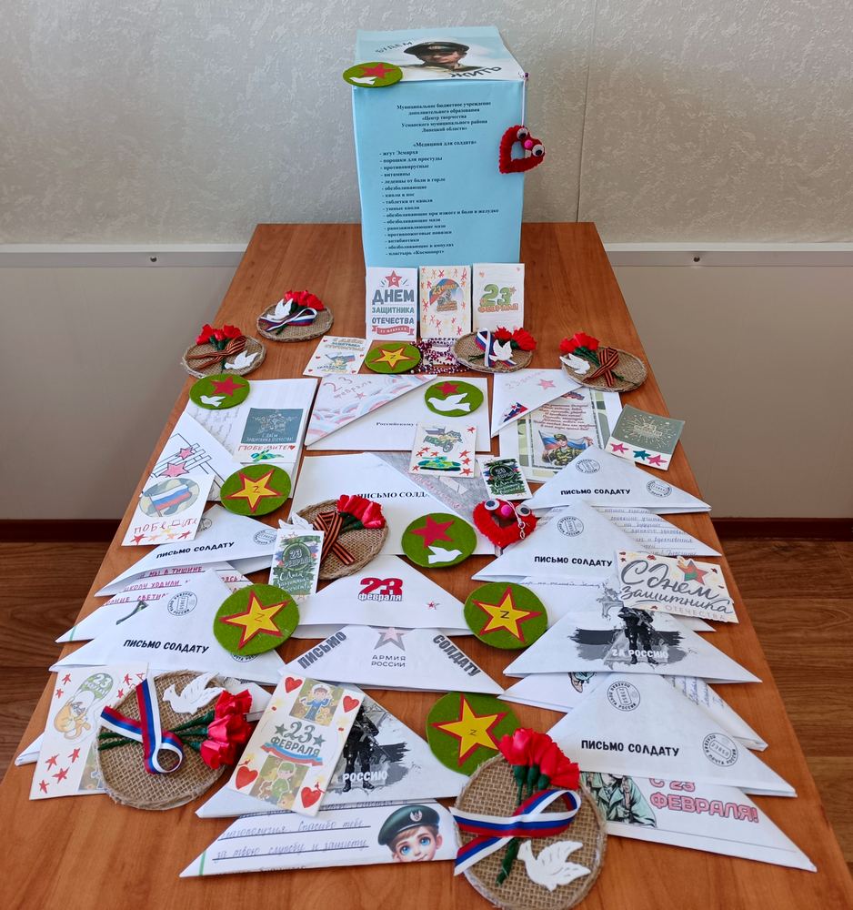 В рамках патриотической инициативы, предложенной губернатором Игорем Георгиевичем Артамоновым, Центр творчества присоединился к масштабной акции по сбору триколорной гуманитарной помощи для участников специальной военной операции. В ходе акции, собранная помощь оформлялась в цветах триколора, для того чтобы подчеркнуть дух единства страны: белые коробки — для фронтовых госпиталей; синие коробки — медицина для солдат; красные коробки — сбор для солдат. Медикаменты для наших защитников были упакованы в синюю коробку. Учащиеся Центра творчества подготовили ко Дню защитника Отечества письма, открытки и сувениры, которые станут символом поддержки и веры в скорейшее возвращение героев домой. Собранный гуманитарный груз был передан в Комитет солдатских матерей Усманского района Липецкой области «Будем жить!».