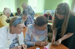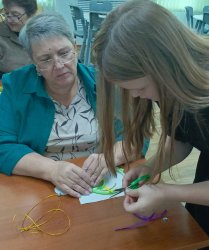 18 сентября в рамках плана работы с гражданами старшего поколения Шавровой Т.М., руководителем объединения «Фабрика декора из лент», и модератором объединения Смольяниновой Викторией проведен мастер-класс «Кулон с цветком» в технике «вышивка лентами». В начале мастер-класса Татьяна Михайловна рассказала участникам историю появления украшения. Потом модератор объединения познакомила присутствующих с технологией изготовления украшения: как правильно вдеть ленту в иглу, как сделать обычные стежки, как правильно работать с лентами. Под руководством Виктории все участники окунулись в удивительный мир творчества. Время прошло незаметно, у каждого участника получилось красивое украшение. А самое главное: все получили массу положительных эмоций.