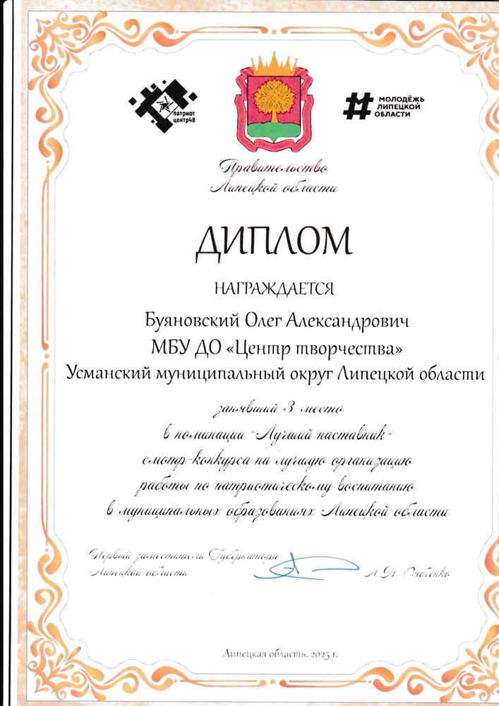26 ноября в Большом зале Правительства Липецкой области состоялось торжественное награждение лауреатов областного смотра-конкурса на лучшую организацию работы по патриотическому воспитанию в муниципальных районах и городских округах Липецкой области с вручением областной награды «Я патриот». Дипломом за 3 место в номинации «Лучший наставник» награжден педагог дополнительного образования Центра творчества, руководитель объединения «Патриот» Буяновский О.А. Поздравляем Олега Александровича с прекрасной наградой и желаем дальнейших успехов!